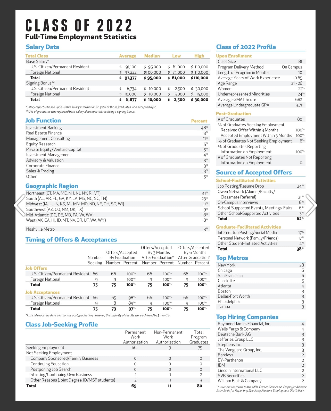The Vanderbilt MSF program places students throughout the country, something that some people might not realize from a program that is technically in the south. Also, students received their offer from a combination of on campus recruiting as well as alumni and networking. The fact that Vanderbilt alumni are so helpful in this process shows the support and satisfaction that graduates of the program have.